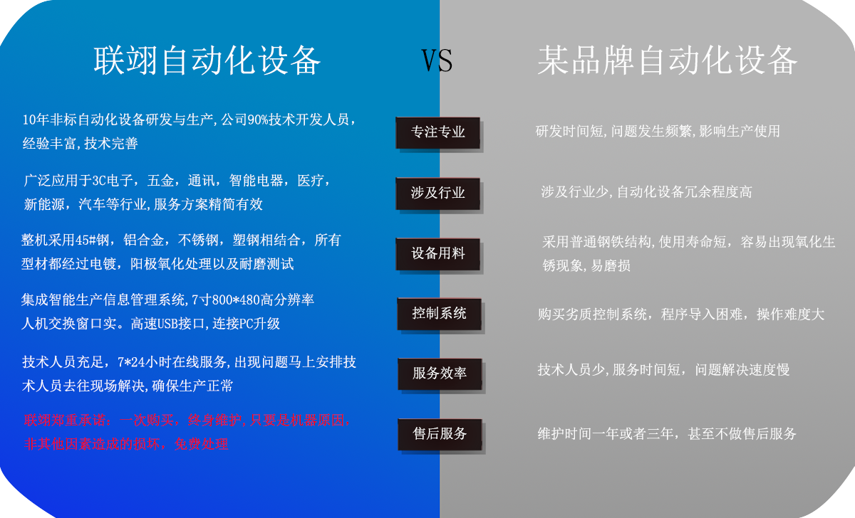 聯(lián)翊智能,10年深耕工業(yè)非標(biāo)自動(dòng)化設(shè)備、視覺檢測系統(tǒng)、自動(dòng)化工廠項(xiàng)目的研發(fā)設(shè)計(jì)、制造銷售。為社會提供高效、智能的的自動(dòng)化技術(shù)產(chǎn)品和服務(wù)。專注于為客戶打造超高度靈活、柔性化生產(chǎn)的智慧自動(dòng)化生產(chǎn)線及服務(wù)方案,幫助客戶提高生產(chǎn)效率、降低成本、提升產(chǎn)品品質(zhì)。